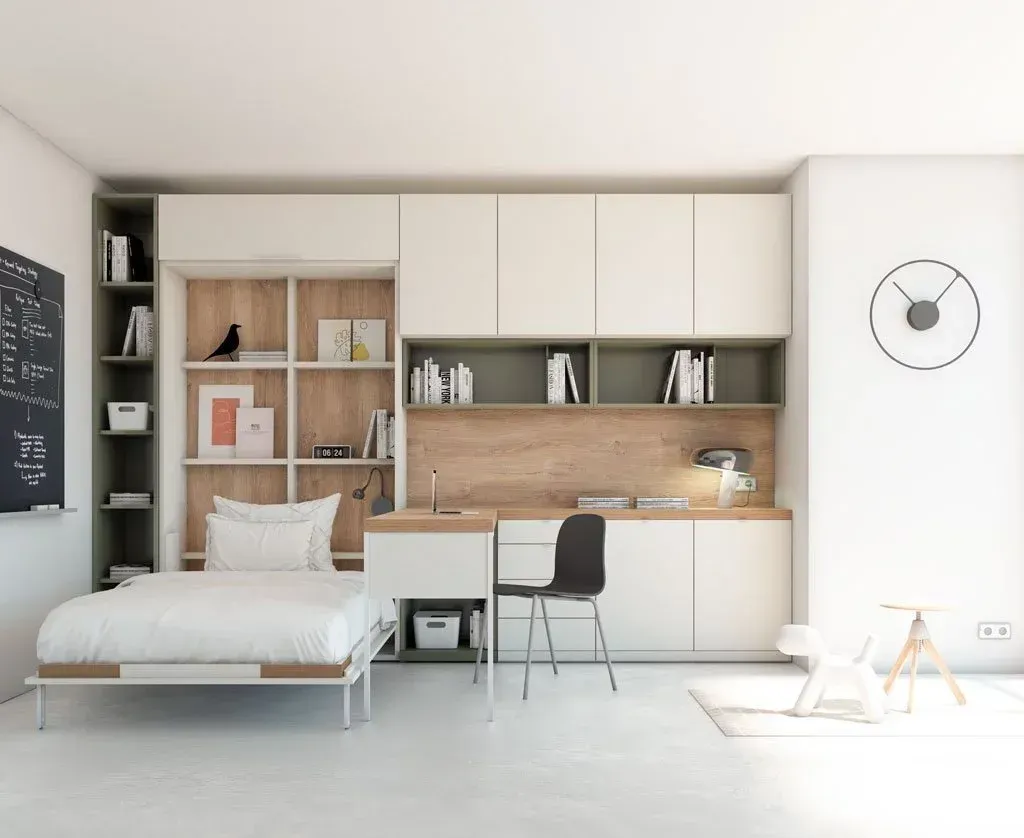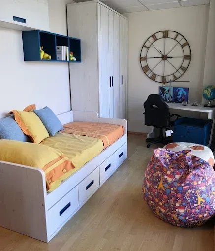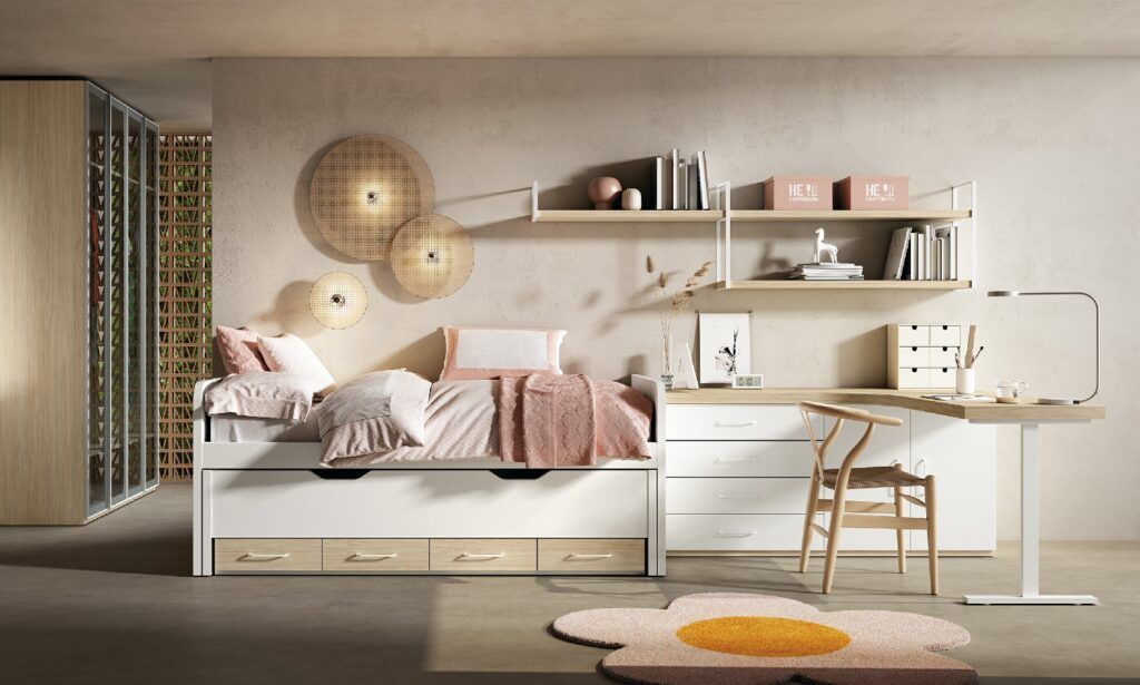 Trabajamos con muebles versátiles y soluciones inteligentes que permiten optimizar el espacio: camas compactas, escritorios, armarios, estanterías y composiciones completas que crean un ambiente equilibrado y práctico. Nuestro objetivo es conseguir habitaciones bien organizadas, agradables y preparadas para evolucionar con el tiempo.